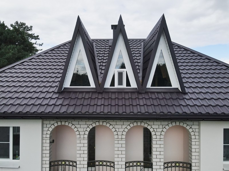Профиль Трамонтана-XL характеризуется увеличенной шириной волны, что придает крыше выразительный рельеф и улучшает жесткость конструкции. Высота волны достигает 50 мм, а шаг — 350 мм, что позволяет эффективно отводить воду и снег. Общая ширина листа — 1190 мм, полезная — 1100 мм, что минимизирует отходы при монтаже. Этот профиль имитирует классическую черепицу, но с современными преимуществами металла, такими как легкость и прочность. В темно-коричневом исполнении он выглядит элегантно и солидно, подходя для загородных домов и коттеджей.